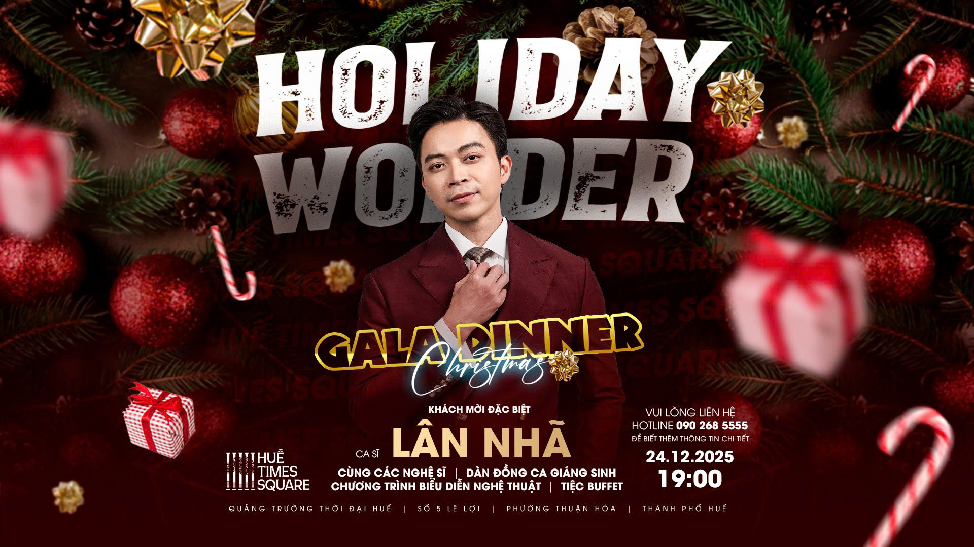Huế Times Square trân trọng giới thiệu sự góp mặt của ca sĩ Lân Nhã trong chương trình Christmas Gala Dinner – Holiday Wonder. Với giọng hát sâu lắng, giàu cảm xúc cùng phong thái trình diễn tinh tế, Lân Nhã hứa hẹn mang đến những khoảnh khắc âm nhạc đầy ấm áp và lãng mạn cho mùa lễ hội 2025.