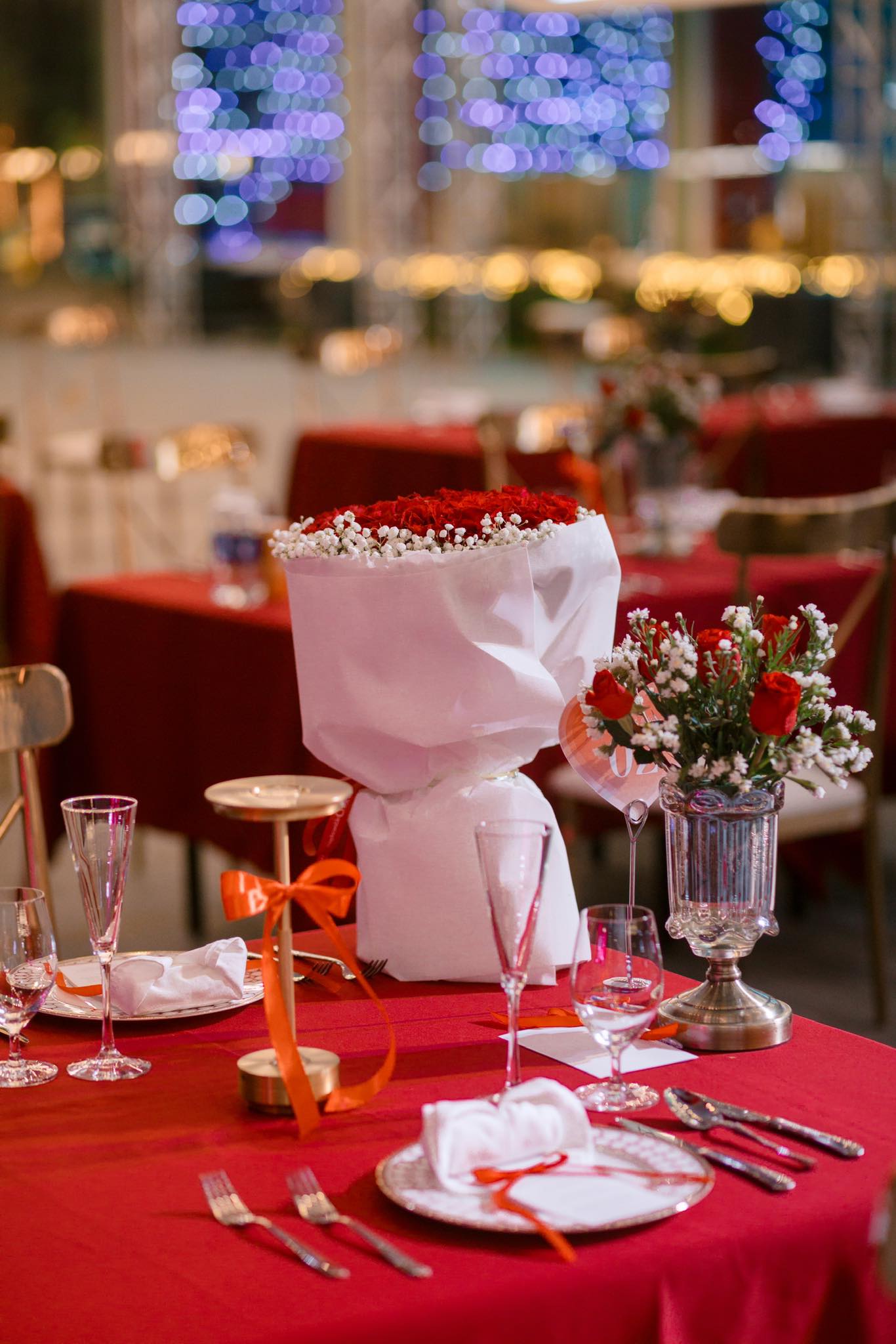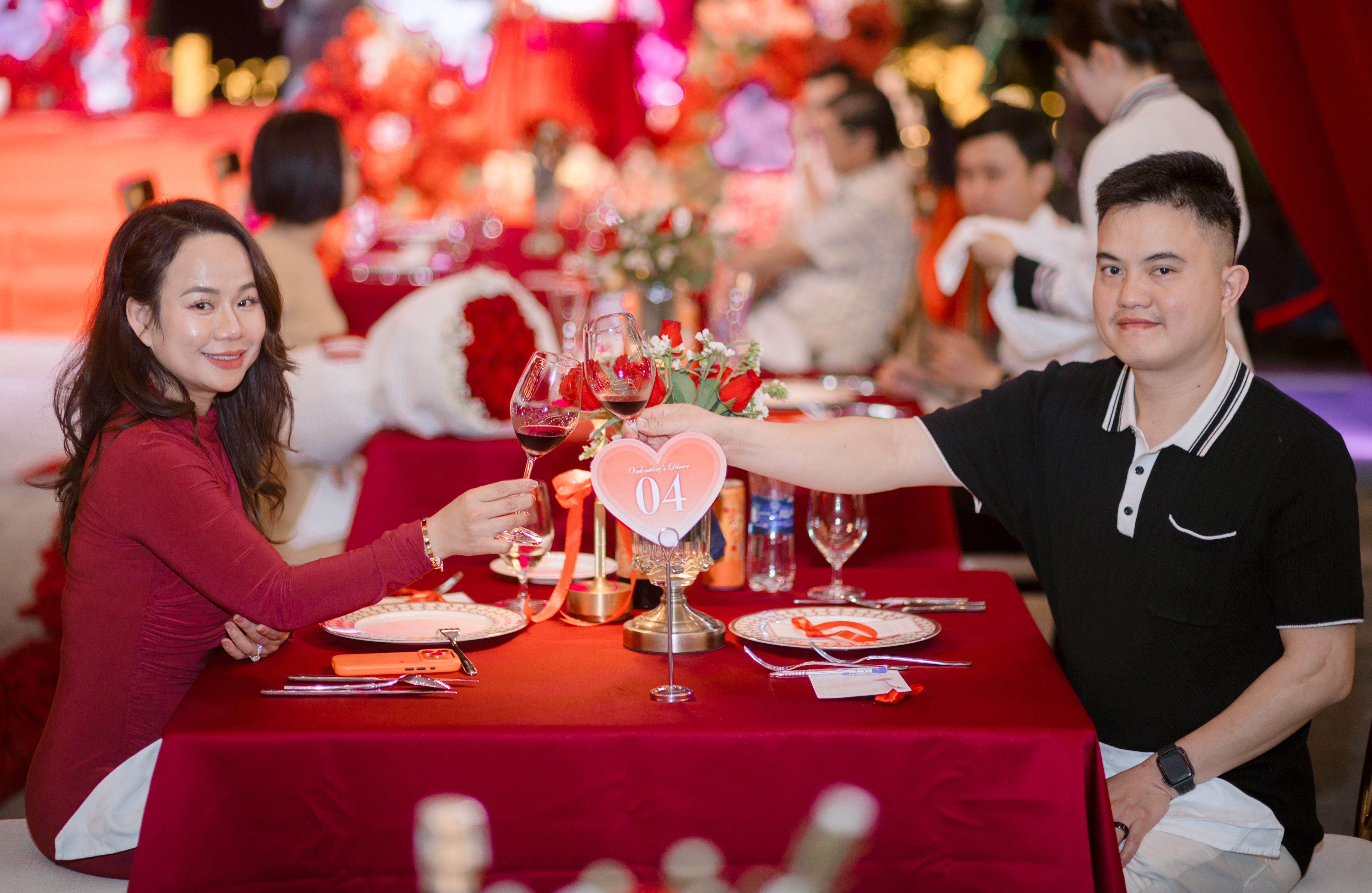 Từng chi tiết trong không gian đêm Valentine được chăm chút tỉ mỉ, tạo nên một tổng thể hài hòa giữa ánh sáng, màu sắc và cảm xúc. Sắc đỏ của tình yêu hòa cùng ánh nến dịu nhẹ, điểm xuyết bởi những đóa hoa tươi, tất cả như góp phần vẽ nên một khung cảnh vừa tinh tế vừa đầy rung động.