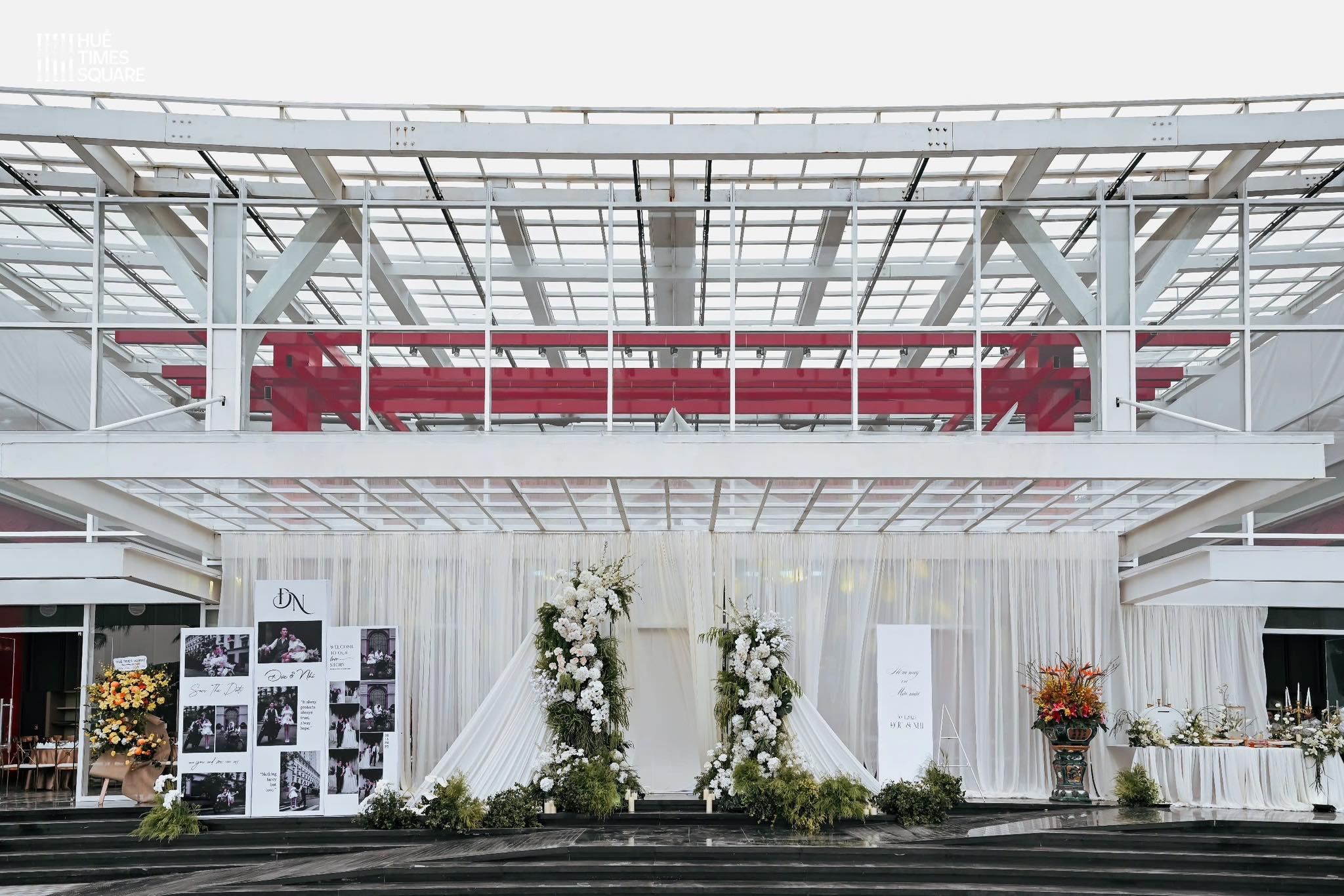 Lễ cưới được tổ chức tại khu sự kiện Quảng trường Thời đại Huế – nơi kết hợp hài hòa giữa sự sang trọng hiện đại và cảm hứng nghệ thuật tinh tế. Từ hệ thống ánh sáng, âm thanh, đến cách bài trí bàn tiệc, phông nền và hoa tươi… tất cả đều được sắp xếp chỉ chu để tôn vinh câu chuyện tình của cô dâu chú rể.
